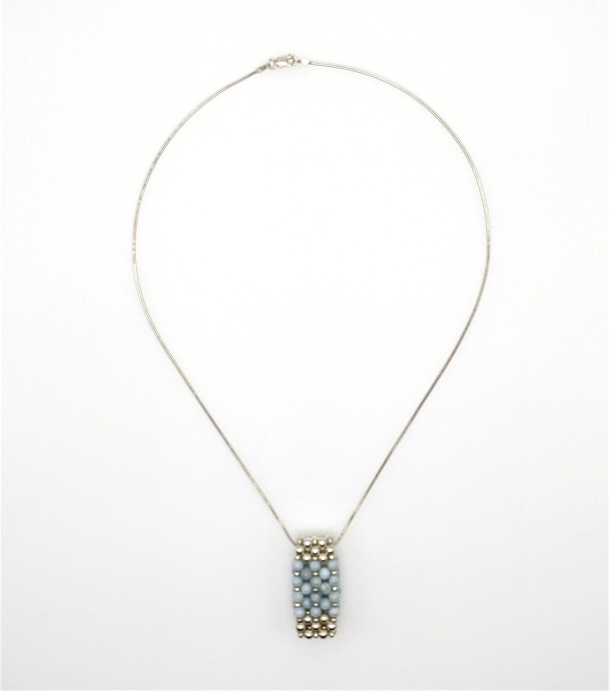 Genuine aquamarine sterling silver slide bar pendant on sterling silver snake chain. Pendant is 1 1/2 X 5/8 X 1/4 inches and has a substantial feel, however, the entire necklace is under 1 oz. The piece features a solid construction of 4mm aquamarine and sterling beads with bright silver seed beads. The pendant slides on an 18" sterling silver snake chain with a lobster claw clasp.