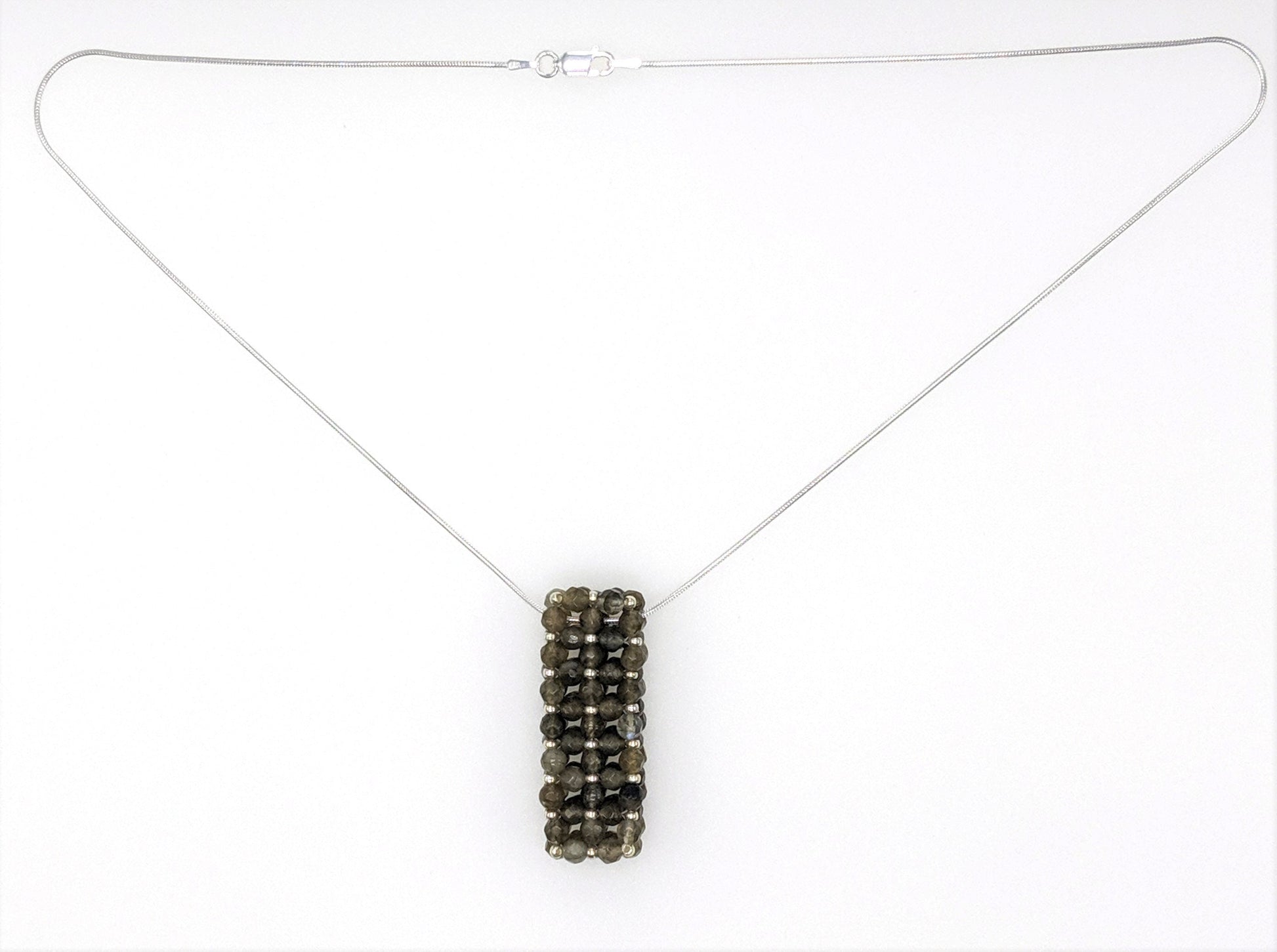 Faceted genuine labradorite slide bar pendant on sterling silver snake chain. Pendant is 1 5/8 X 5/8 X 1/4 inches and has a substantial feel, however, the entire necklace is under 1 oz. The piece features a solid construction of 4mm faceted rondelle labradorite beads in an olive green hue accented with bright silver seed beads. The pendant slides on an 18" sterling silver snake chain with a lobster claw clasp.