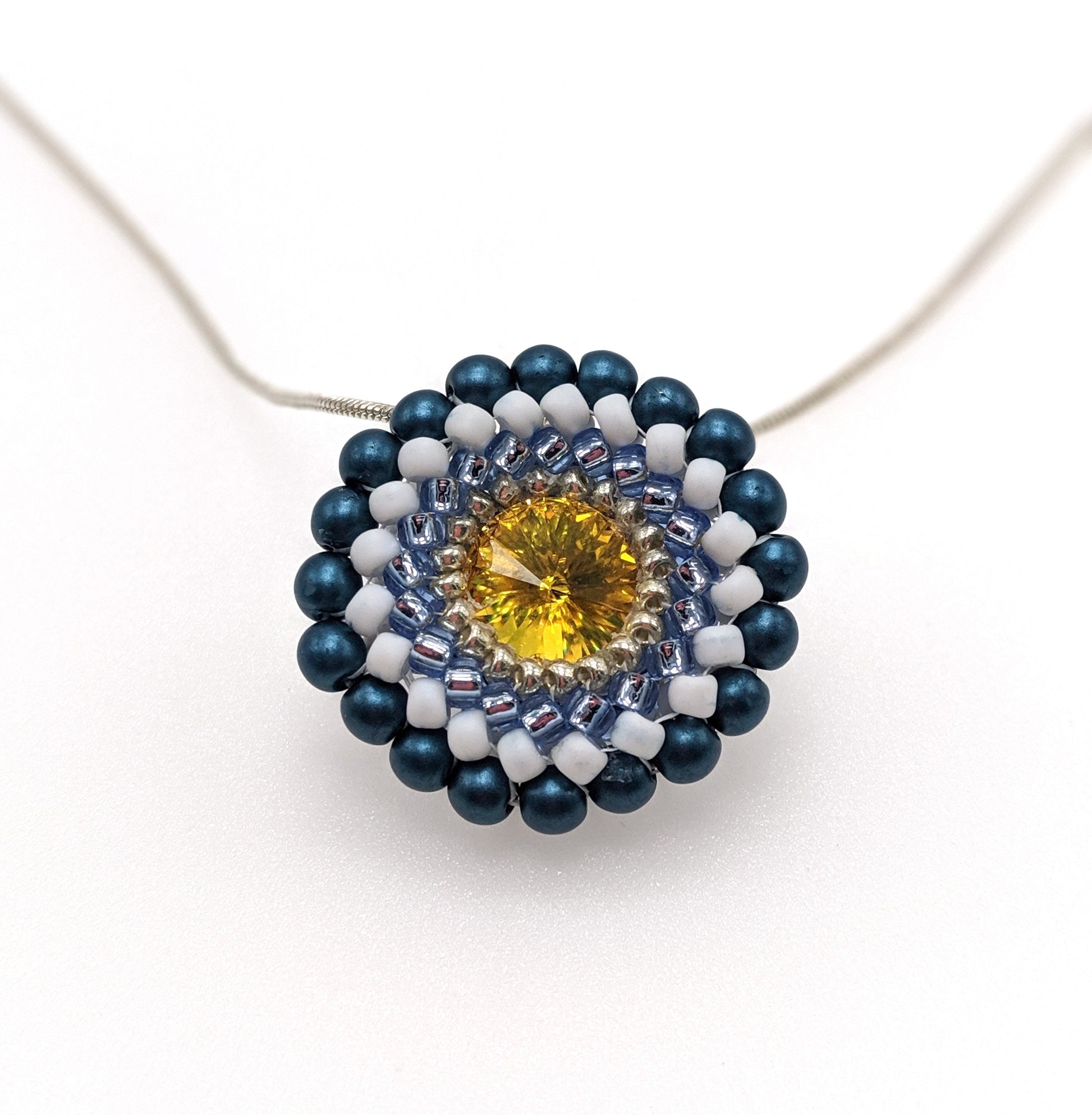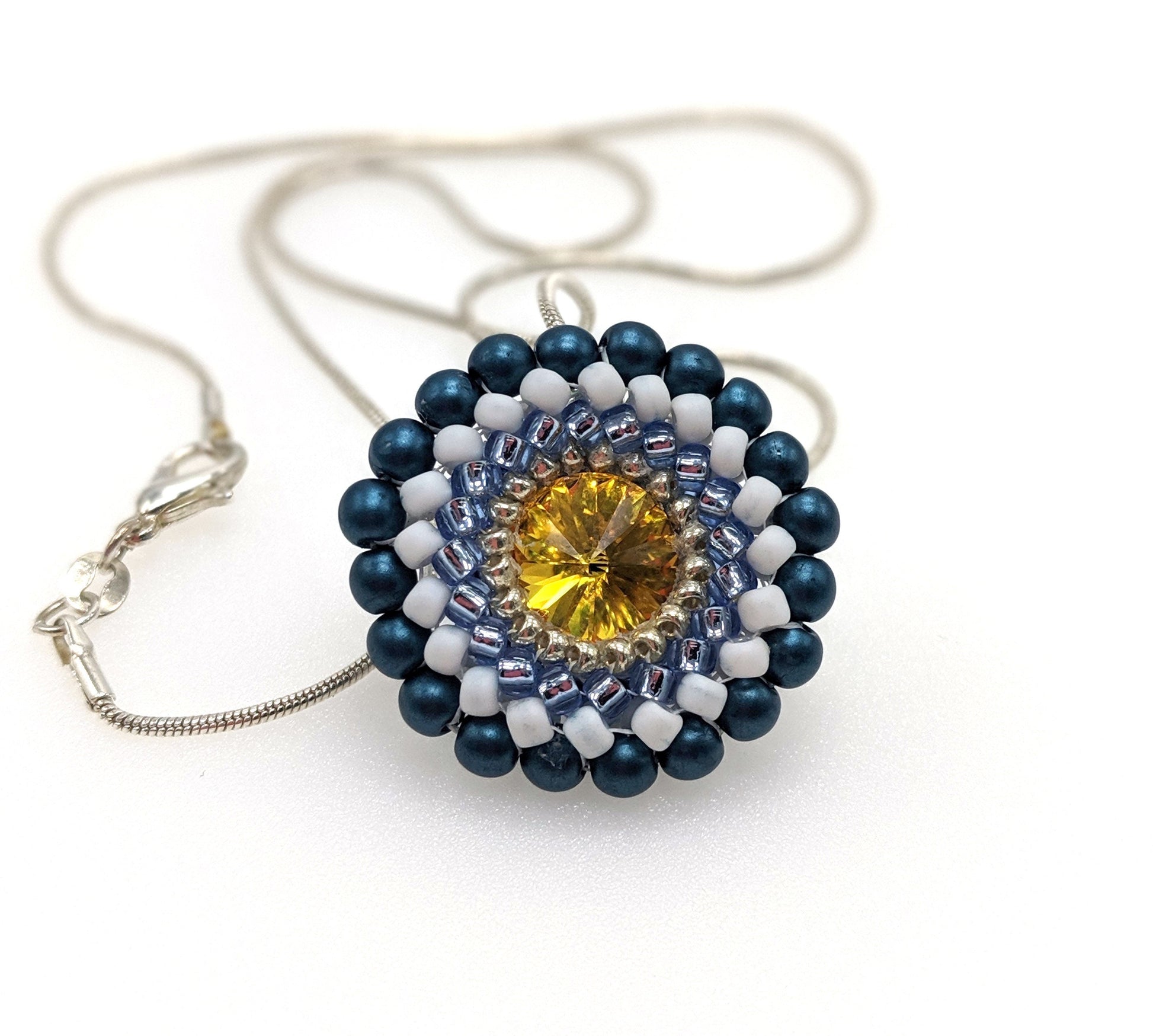 Blue and white beaded flower made of Japanese seed beads and Czech pressed glass rounds. Center is a Swarovski crystal. Pendant is 1 1/4 inches across and is just over 1/4 inch deep. Center is recessed into piece. The pendant slides on an 18" sterling plated snake chain with a lobster claw clasp.