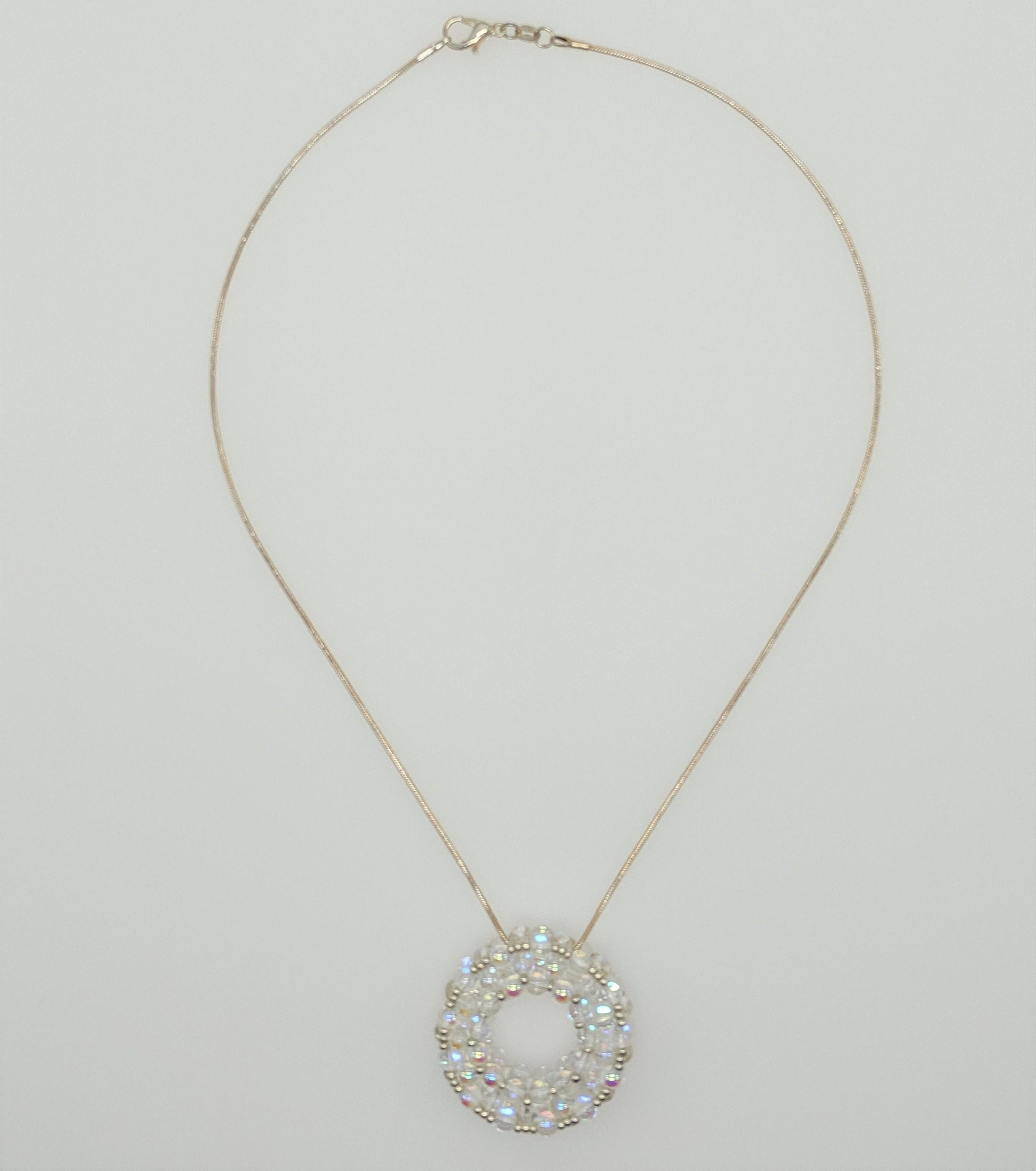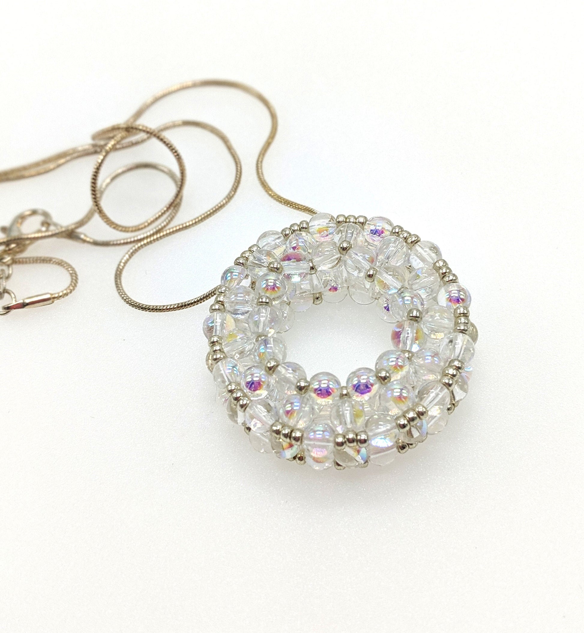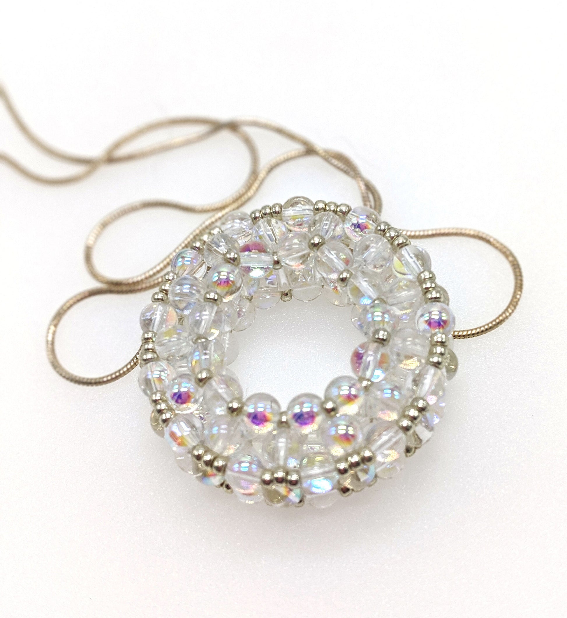Pressed glass rounds with aurora borealis treatment in a circular slide pendant on silver plated snake chain. Pendant is 1 1/2 diameter circle X 3/8 inches high and has a substantial feel, however, the entire necklace is a under one oz. The piece features a solid construction of 4mm glass beads, accented with silver seed beads. The pendant slides on an 18" sterling plated snake chain with a lobster claw clasp.