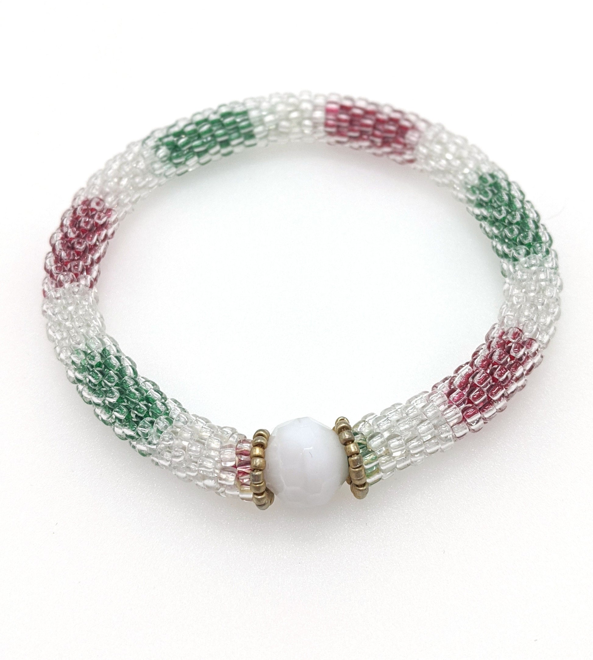 One of a kind hand crocheted necklace. Button closure. 18 1/2" is choker/princess length due to the chunky design. Crocheted with 100% cotton. Constructed of a section of crocheted rings with a crocheted poinsettia in the center. Coordinating bead crochet bangle comes with the necklace. 9" bangle with a 2.5" inner diameter. Is flexible and rolls onto hand. Made with clear Japanese seed beads with an inner core of matching thread. Accented with a white Czech glass fire polished bead.