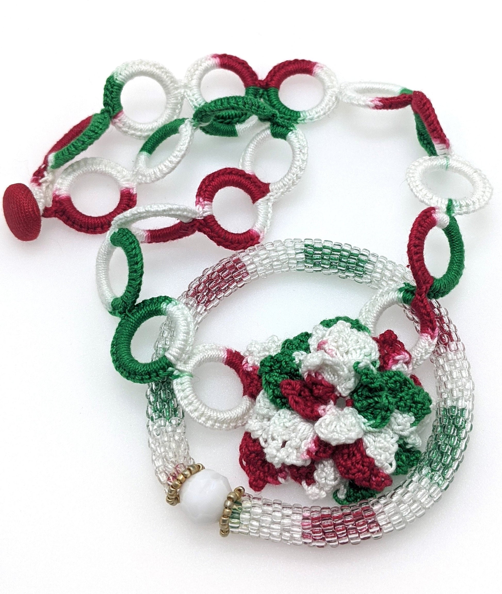 Christmas Crochet Flower Choker Necklace & Bead Crochet Bangle Set