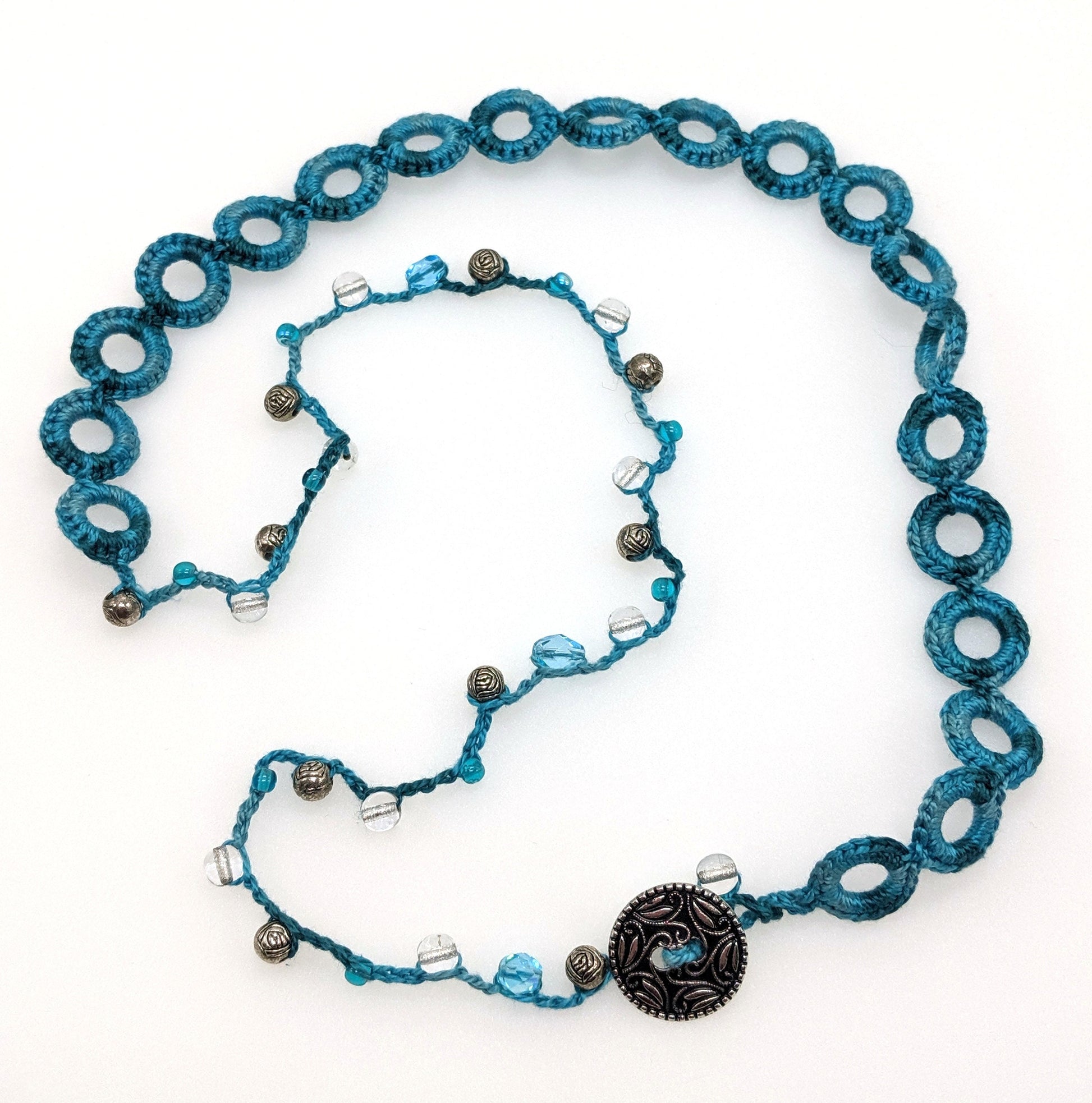 One of a kind hand crocheted wrap bracelet. 29" long for a quadruple wrap for most wearers. Can also be worn as a long necklace. Antique silver colored button button closure. Crocheted with 100% cotton. Constructed of a section of crocheted rings and a section of bead crochet with Czech glass and antique colored beads. Very comfortable piece and makes a great gift due to the flexible fit.
